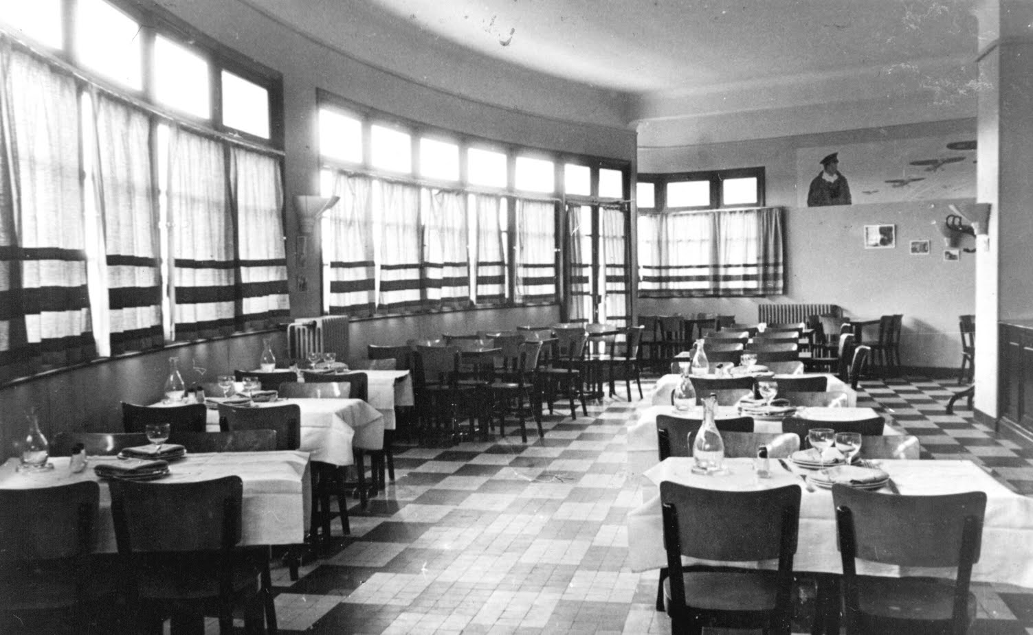 L’intérieur avec la salle de restaurant située au rez-de-chaussée. (Photographie : collection Jean-François Barcat). L’aérogare comporte également le pavillon d’habitation du mécanicien, des citernes à essence, un garage et un parc à voitures.