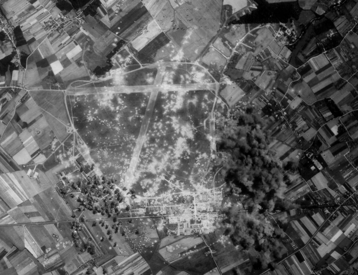 En 1944, les alliés (U.S. Air Force et Royal Air Force) bombardent lourdement le terrain en janvier, février, mars et mai. Plusieurs milliers de bombes sont lâchées sur les installations, que les allemands avaient éparpillés pour minimiser l’impact des attaques. Les très nombreux bombardements de cette période obligent encore à procéder à des recherches pyrotechniques dès que l’on veut creuser le sol encore aujourd’hui.