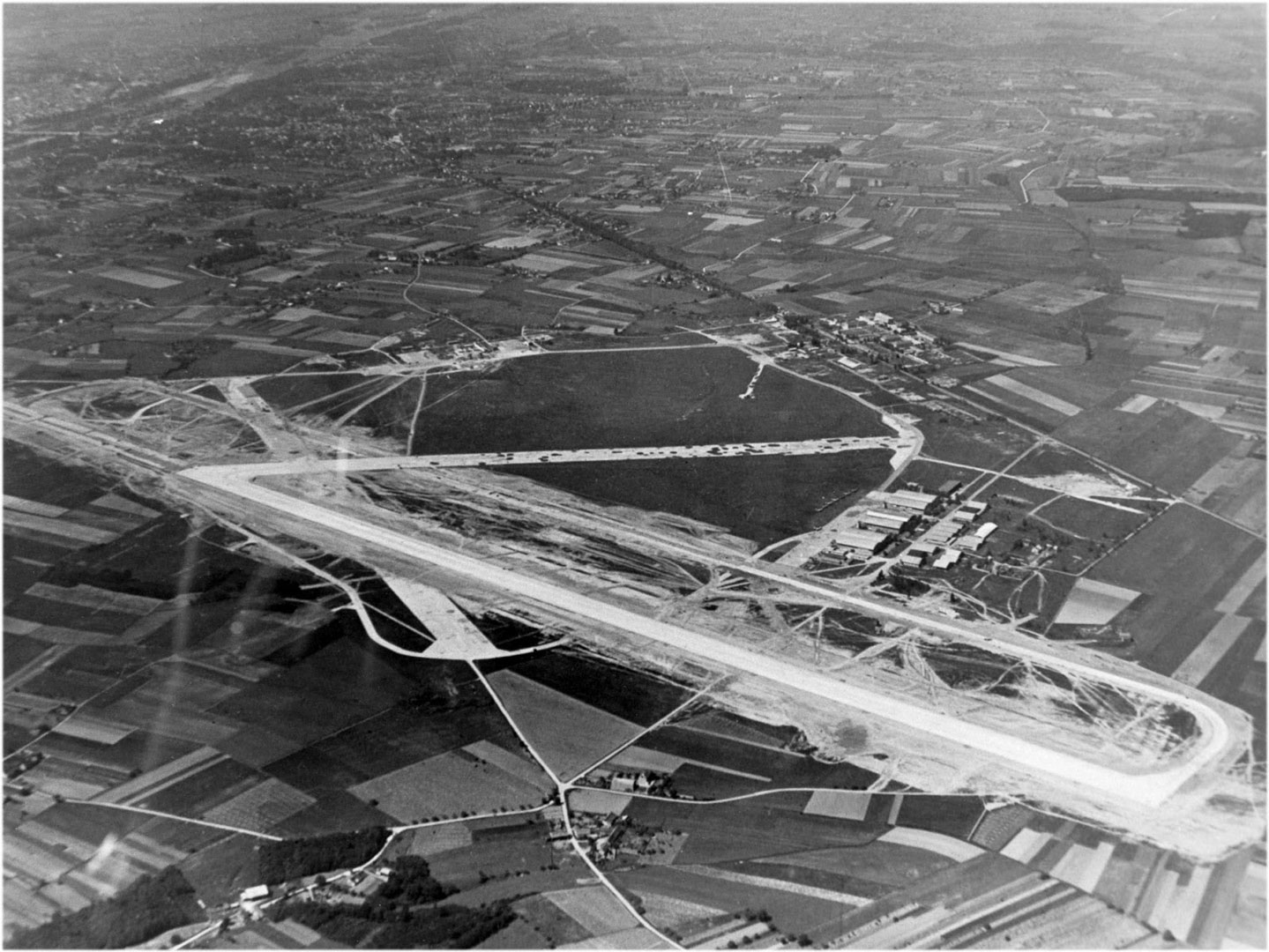 Vue aérienne du terrain prise le 27 mai 1952 : construite sur les restes de la piste 05/23 allemande, la nouvelle piste 02/20 entre en service en juillet.